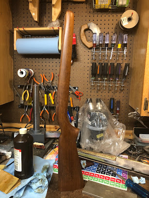 I’ve also started sanding the lacquer finish on the stock. It looks like walnut, and I think a sand-and-fill with Tru-Oil will look pretty good when I’m done. Stay tuned.